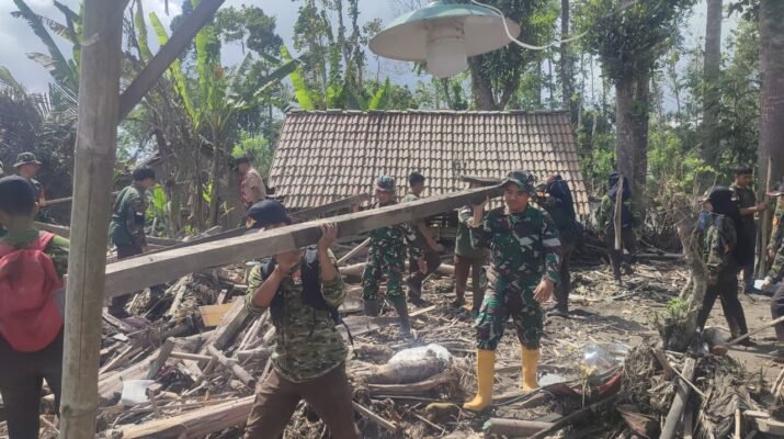 Gandeng Saka Wira Pramuka, Personel TNI Lumajang Bersihkan Puing Rumah Warga Terdampak Lahar Dingin Semeru Lumajang — Upaya percepatan pemulihan pascabencana lahar dingin Semeru