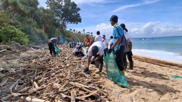 Sinergi Tanpa Batas TNI dan Warga ‘Geruduk’ Pantai Pancur Bersihkan Sampah Kayu Gotong royong di Pantai Pancur, kawasan Taman Nasional Alas Purwo, saat personel