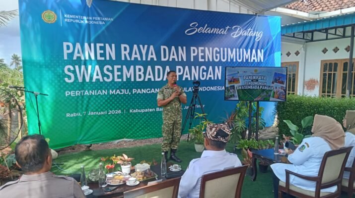 Dandim 0825/Banyuwangi Hadiri Panen Raya dan Pengumuman Swasembada Pangan Bersama Presiden RI Secara Daring Cluring – Komandan Kodim (Dandim) 0825/Banyuwangi, Letkol Arm Triyadi Indrawijaya,