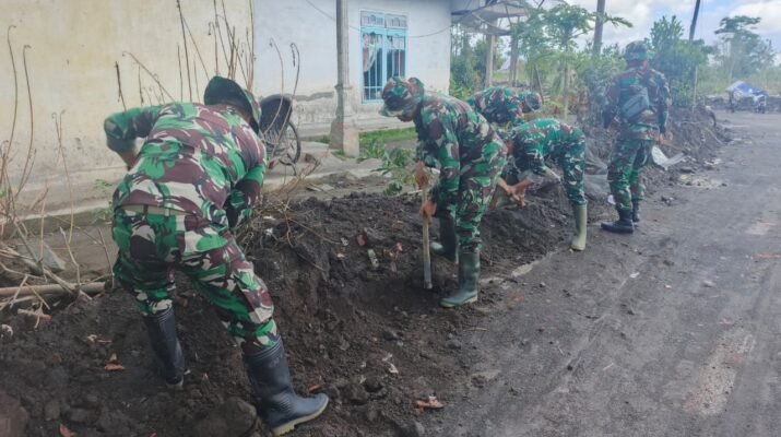 Personel Siaga Bencal Bersihkan Akses Jalan di Supiturang, Dipimpin Langsung Danramil Pronojiwo Lumajang — Personel Siaga Bencana Alam (Bencal) bergerak cepat melaksanakan pembersihan jalan