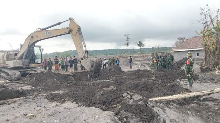 Pulihkan Permukiman, Personel TNI dan Relawan Evakuasi Material Vulkanik di Gumukmas. Lumajang — Upaya pemulihan pascaerupsi Gunung Semeru terus dilakukan secara intensif oleh jajaran